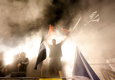 Douglas Morrison, Luxora, Arkansas, dances as the fireworks fly after Barack Obama's nomination speech at Invesco Field in Denver.